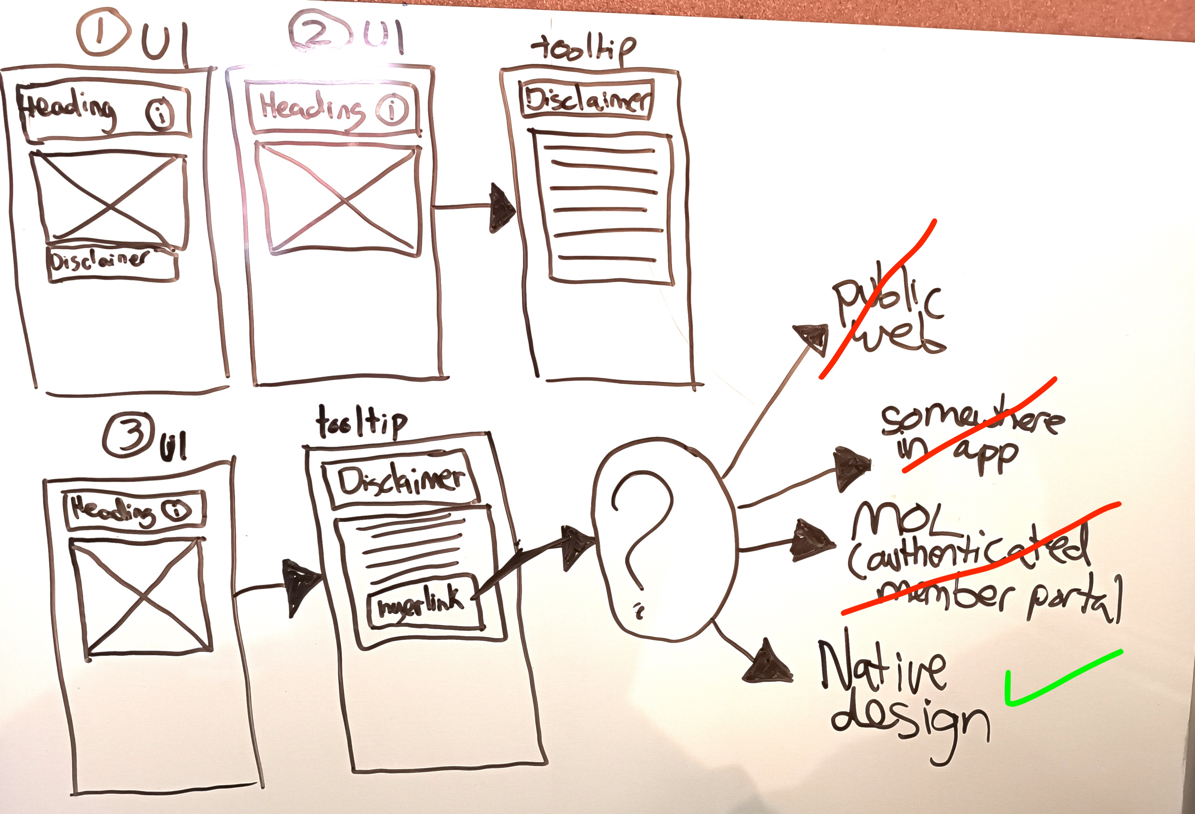 The obvious place to put legal disclaimers was in tooltips. But with our design pattern, tooltips were already doing heavy lifting. And I wanted to keep them useful, not a dumping ground for legal requirements. Because this was a content problem, it was my job to squeeze the ol' brain juices and come up with some ideas for what we might do.