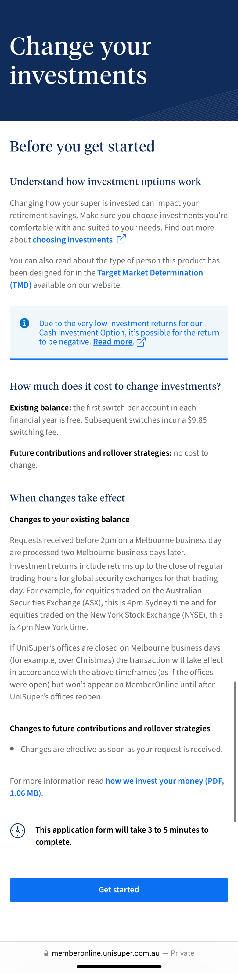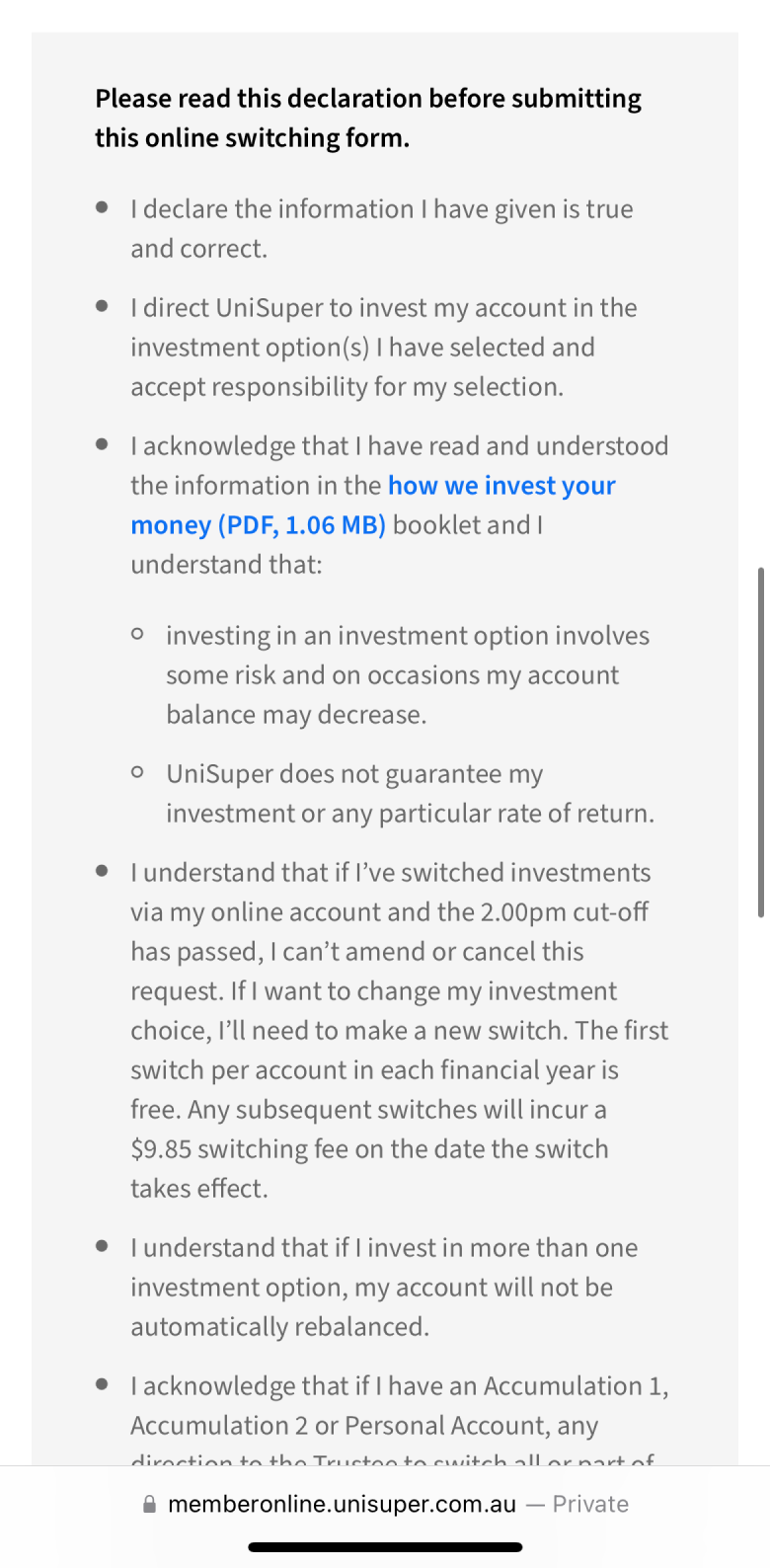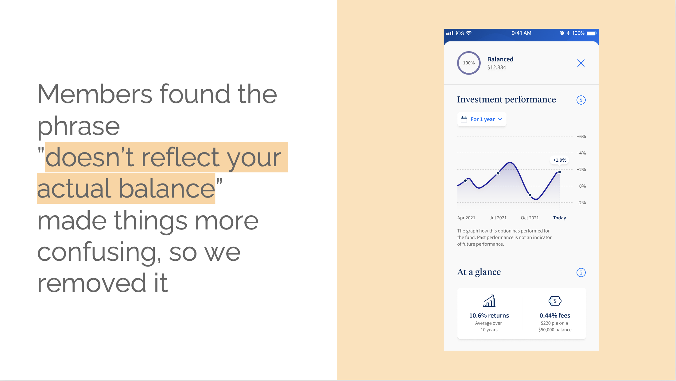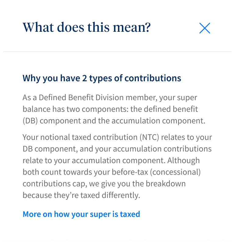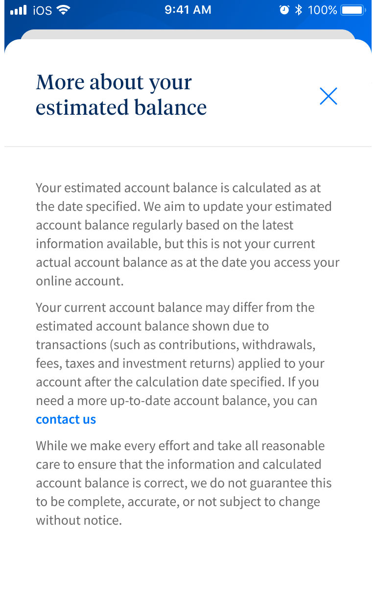 Because finance is a highly regulated industry, digital experiences can get messy with legal jargon and disclaimers. UniSuper was no exception. In the existing member portal, I found long-winded disclaimers stuffed wherever they'd fit. Space wasn't an issue because it was a desktop-first platform. The app was a different story.